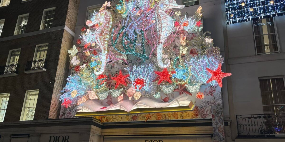 Dior has transformed Bond Street into a mesmerizing marine wonderland with its 2024 Christmas display. Inspired by the ocean, the installation features intricate seahorses, starfish, and coral, creating a captivating underwater scene. This aquatic theme ties into Dior’s Cruise 2025 collection, bringing the spirit of the sea to the heart of London. While it departs from traditional festive motifs, its luxurious design and bold creativity have made it an unforgettable spectacle, drawing every passerby to stop and capture the moment.