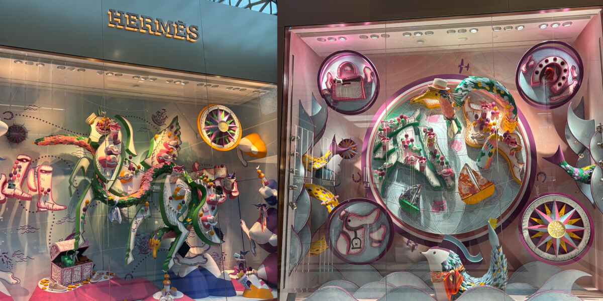 The Hermès window we saw unfolded like a dreamscape at sea, where pastel waves cradled a fantastical creature draped in silk, and a compass rose guided the viewer toward realms of imagination. This juxtaposition of sophistication and imagination reflects Hermès’ commitment to both craftsmanship and creativity, making the brand feel aspirational yet approachable.