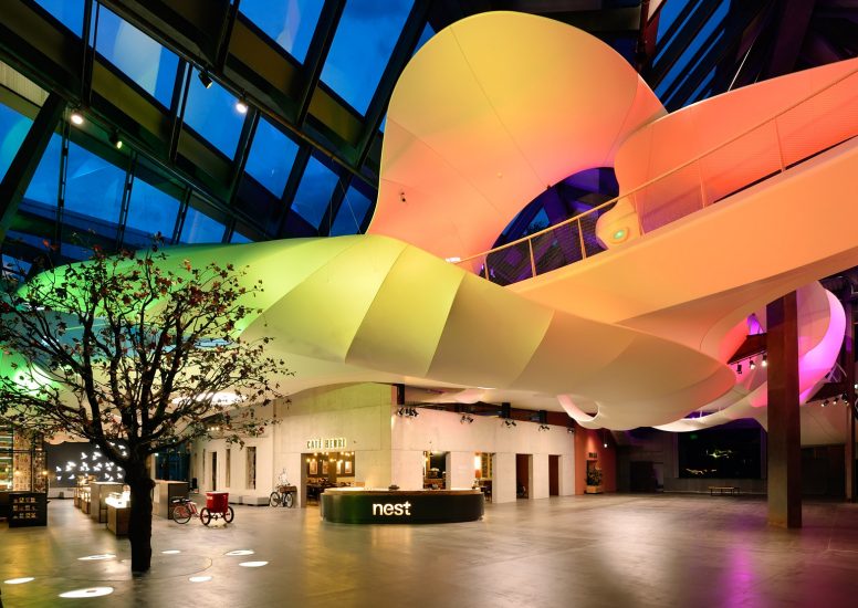 There was a lot of significant architectural pieces that was included in the renovation of the space. Tinker Imagineers who were involved with the project for over 2 years wanted to get the balance of the industrial design of the factory right as they wanted to create a more organic interior. In the central atrium it features a large, flowing ramp that links the different areas together, it also lights up at night in various contrasting colours.