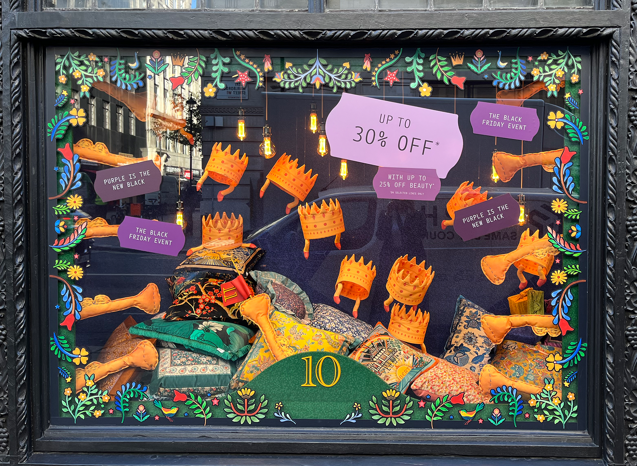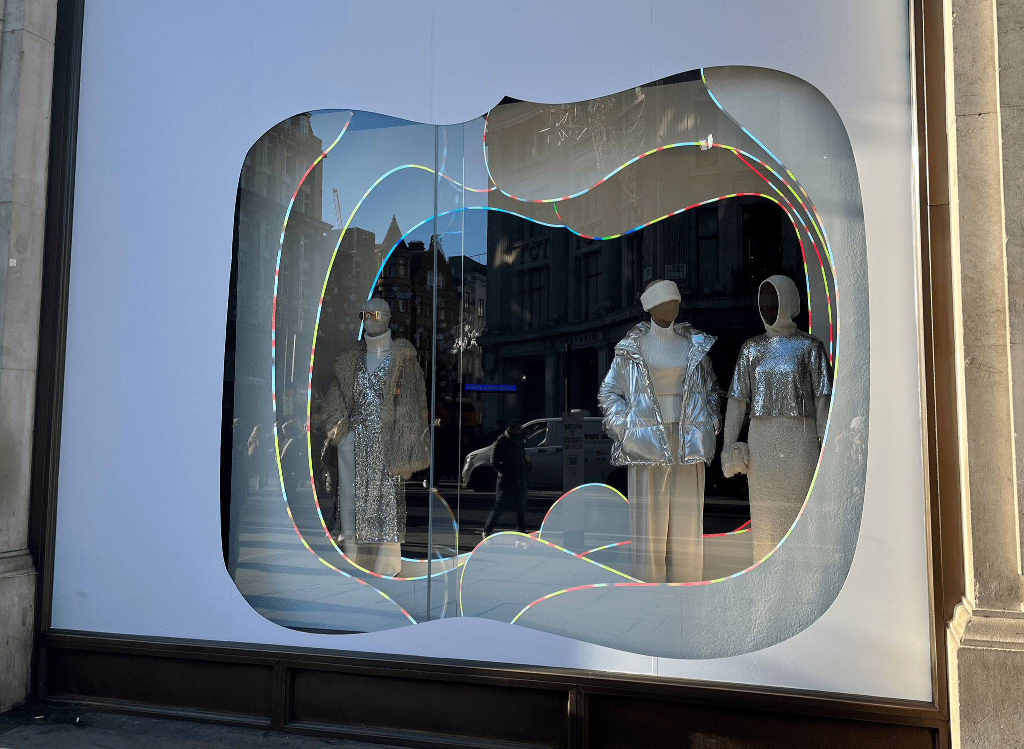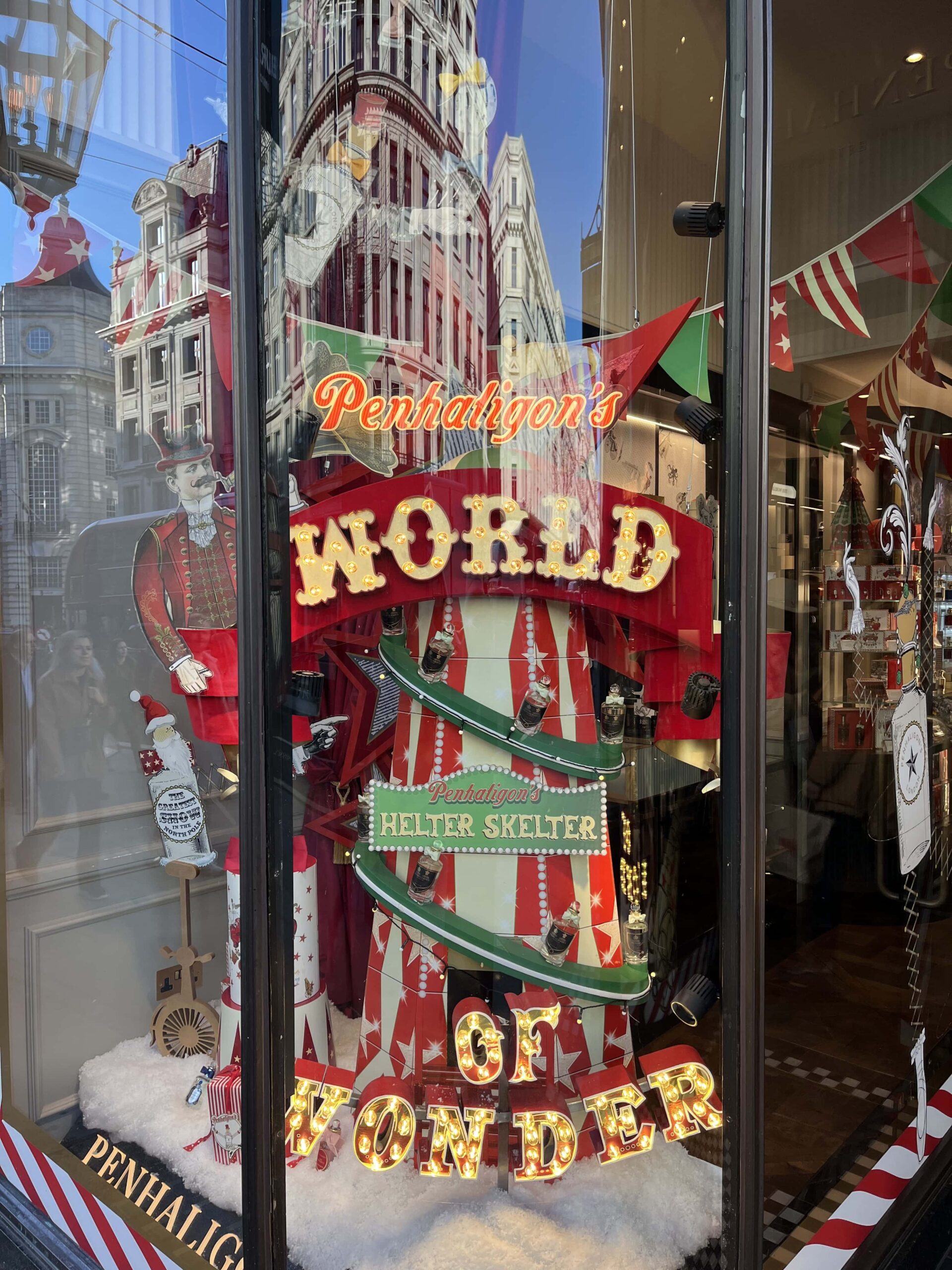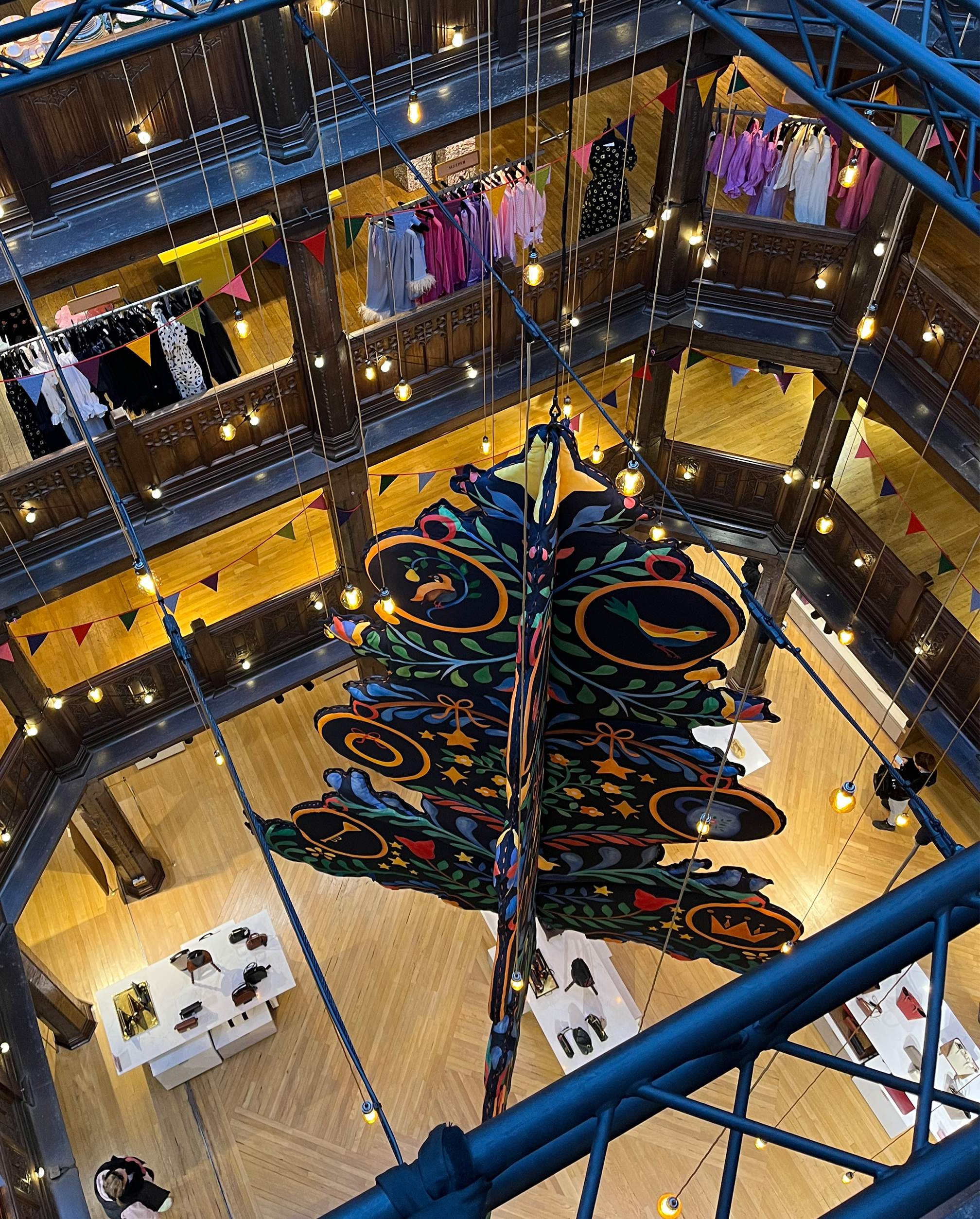 The Christmas décor didn’t stop at the windows, it continued inside the store with several embellishments, including larger-than-life baubles and Christmas puddings, a glitzy selfie wall on the 4th floor within the “Christmas Shop”, and a revolving washing-line-inspired Christmas tree showcasing green garments – a nod to the well-known ‘Reselfridges’ campaign.