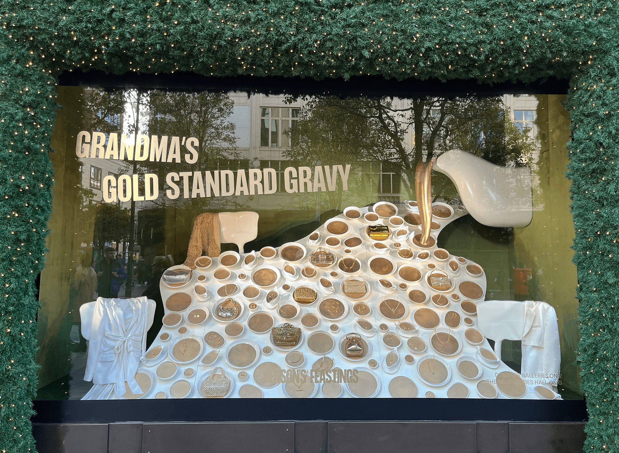 In order to visualise this, the Selfridges team has designed a series of playful window displays that uses food pairings and serving suggestions to capture moments of family traditions and cherished memories! The festive period means different things to different people, for some it is about lounging in your PJs all day and playing games, and for others, it is a day of dressing up and eating as much as humanly possible – whatever it may be, Selfridges has captured it in its various tongue-in-cheek displays (with my personal favourite being “Brussels a la car(te)”!).