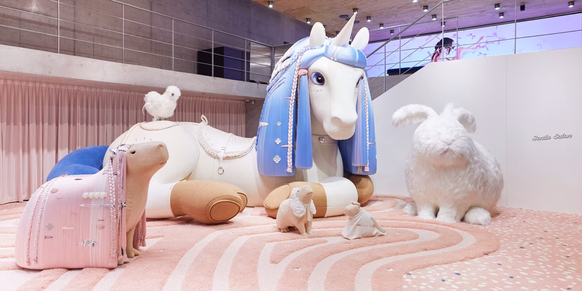 Featuring in 13 pop-up stores globally, each space carefully explores the world of gentle fashion. With the help of a pink fluffy unicorn mascot, the character demonstrates how each charm has a multifunctional use of also performing as hair and clothing accessories. Further reinforced by ‘chubby’ style furniture and luscious pink surroundings, the collection projects its aura into an immersive dreamscape. Whilst transforming these spaces attracts avid ‘Gentle Monster’ consumers and encourages their engagement, they also honour the hero product in its fitting landscape.