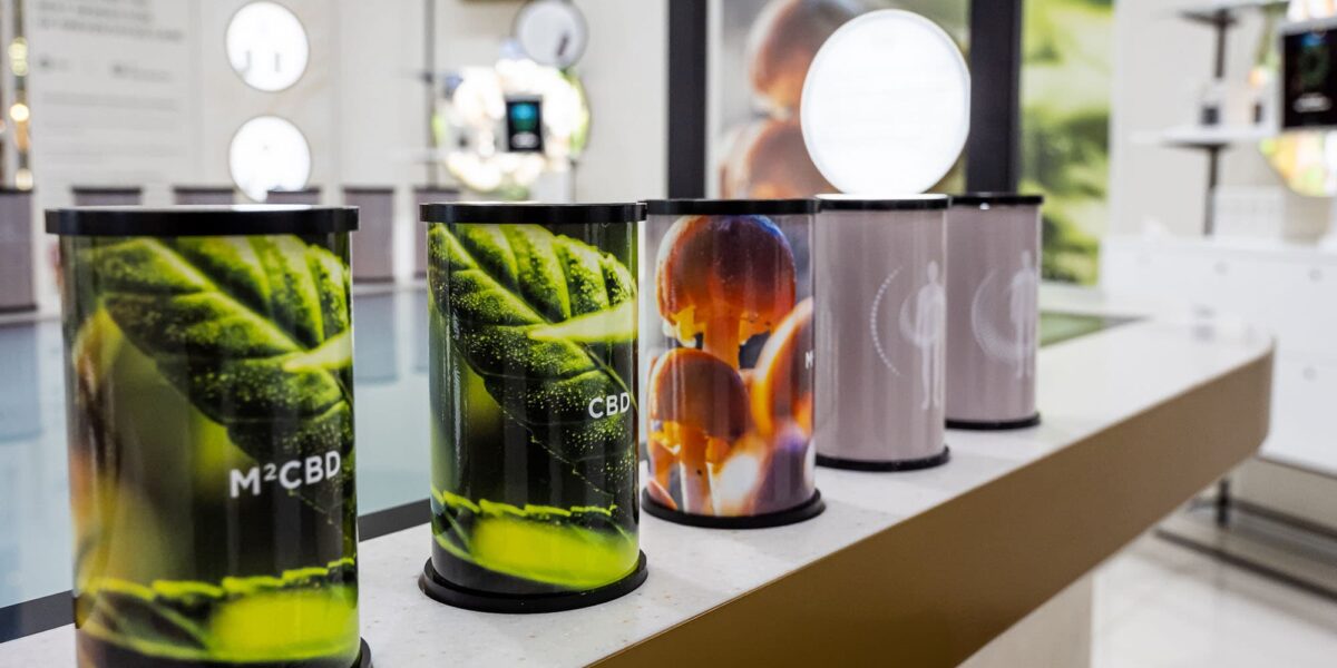 Within the core of the space is an interactive touch sensitive table allowing customers to learn about the blend of ingredients that make up Cannabotech’s products, and enlighten themselves to the body’s endocannabinoid system, delving into the efficacy of the unique M2CBD formula. This educational and exploratory element within the store seeks to engage customers, leveraging RFID-based lift and learn technology to activate immersive content. The system also activates large overhead screens, channelling digital media and educational content into the store environment to take over the space.