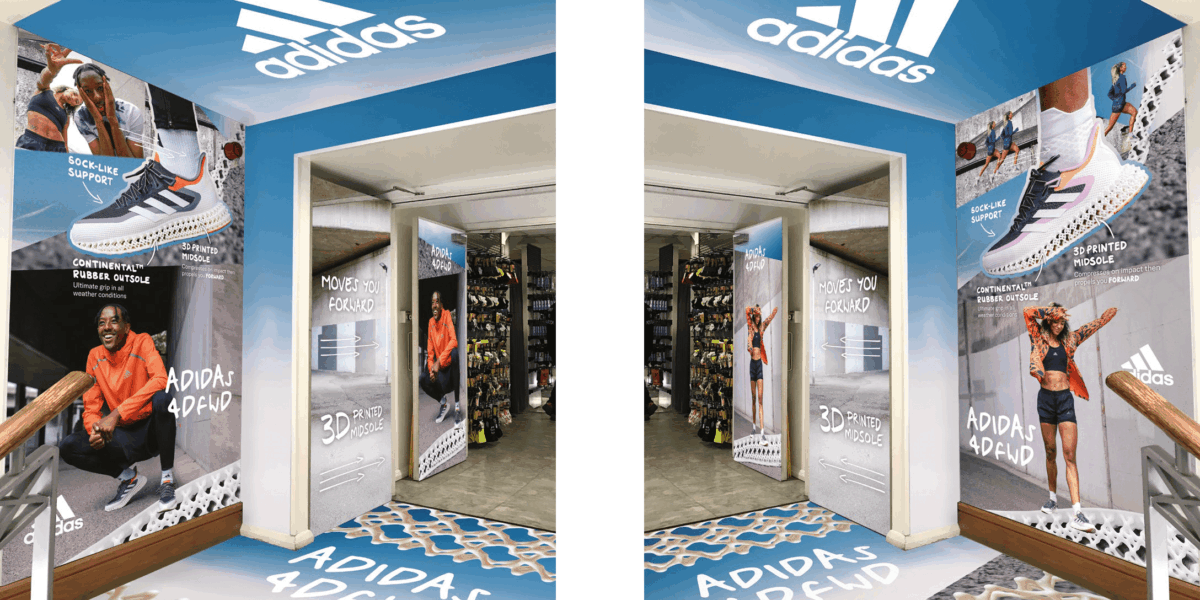 Exclusive to just five Sports Direct locations across the UK ā Birmingham New Street, Glasgow Argyle, Leeds, Piccadilly, and Oxford Street ā this instore product marketing campaign aimed to generate heat around the launch of adidasā new 3D midsole printed running shoes which provide an āall-new running experience [ā¦] moving you forward with every stride.ā