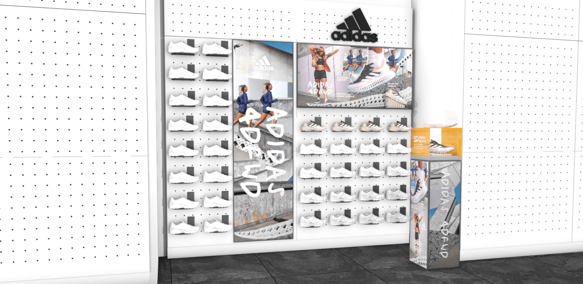 From storyteller launch zones, footwear walls, and midfloor bays to a stairwell, gait analysis zone and store entrance, we created a kit of Adidas 4DFWD campaign assets that could be applied to existing adidas retail systems, and other areas appointed for temporary use by adidas within the Sports Direct stores.