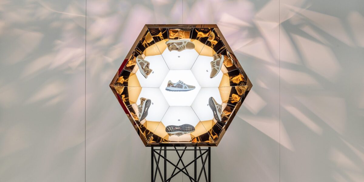 Shard-like projections paired with soft, ambient lighting created an ethereal sense of movement, allowing the golden Ultraboost shoe to command the spotlight it so richly deserves.