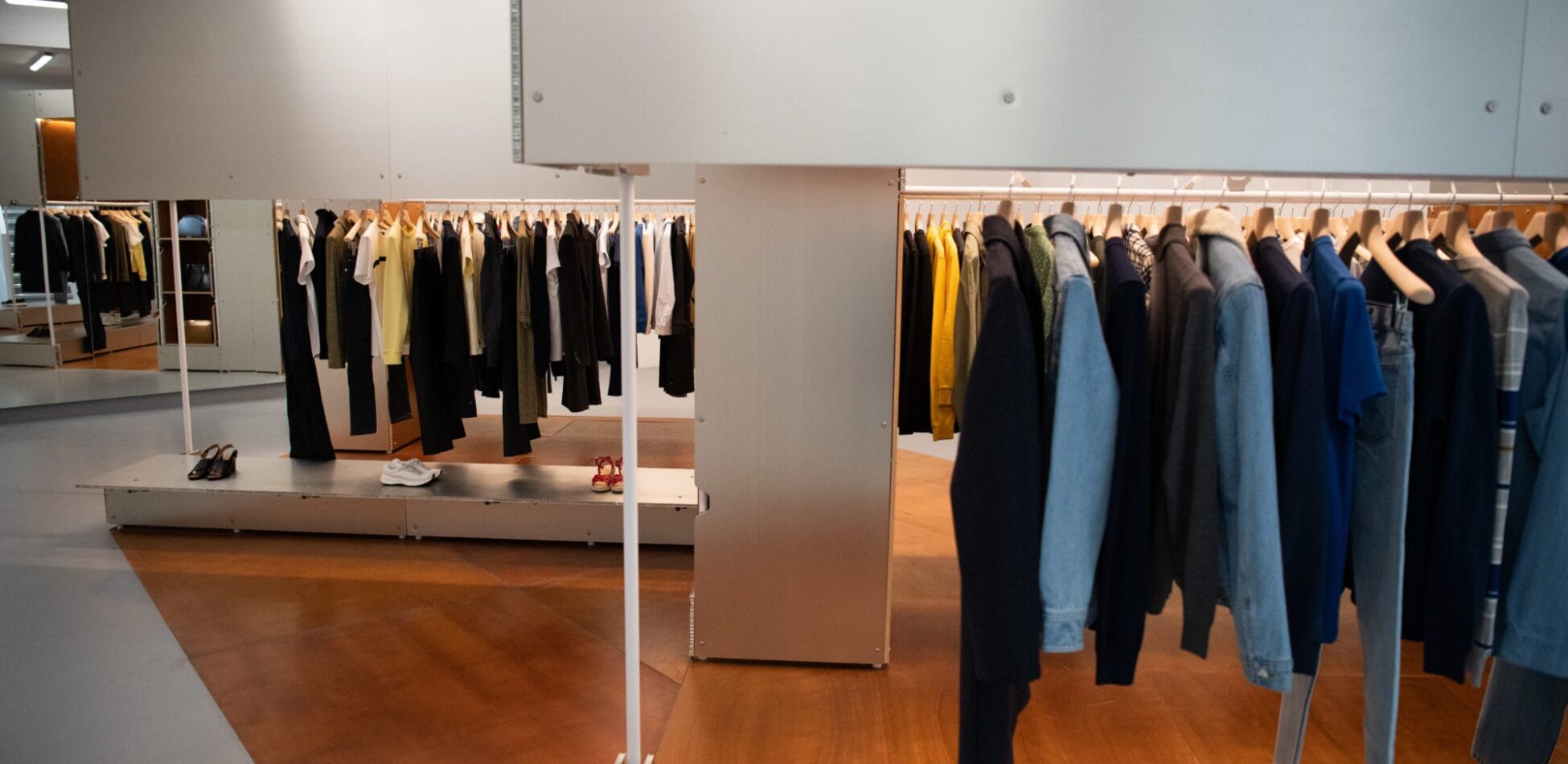 Paired back with simplistic dĆ©cor by way of unembellished white walls and unobtrusive grey flooring, this store concept houses several stand-alone eye-catching modules which opulently display the apparel of the store. Introducing warm wooden elements and considered lighting into the store, which sits just a couple of doors down from the popular Glossier pop-up, these contemporary mistral modules bring in a touch of brand familiarity from A.P.C.ās previous store concepts.