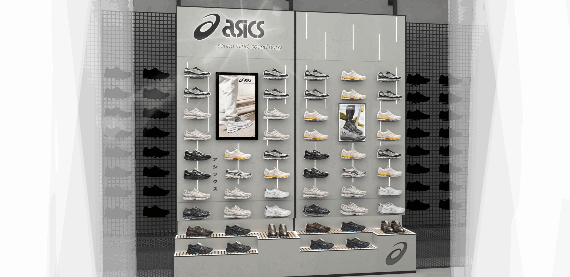 The final concept struck a balance between flexibility and authenticity by allowing elements to adapt to each store, while integrating ASICSā Japanese characters in dark grey, a subtle nod to the brandās heritage.