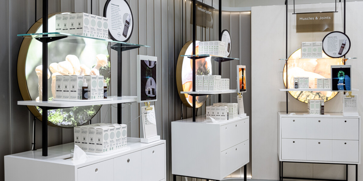 At the visual merchandising and product display level, product density is deliberately lighter to give an elevated and premium feel, with storage below for easy stock replenishment. This made ample space for the inclusion of interactive touchscreens within the display to allow for further customer engagement, and promotion of the Cannabotech āMy Beingā app for onward support and aftercare.
