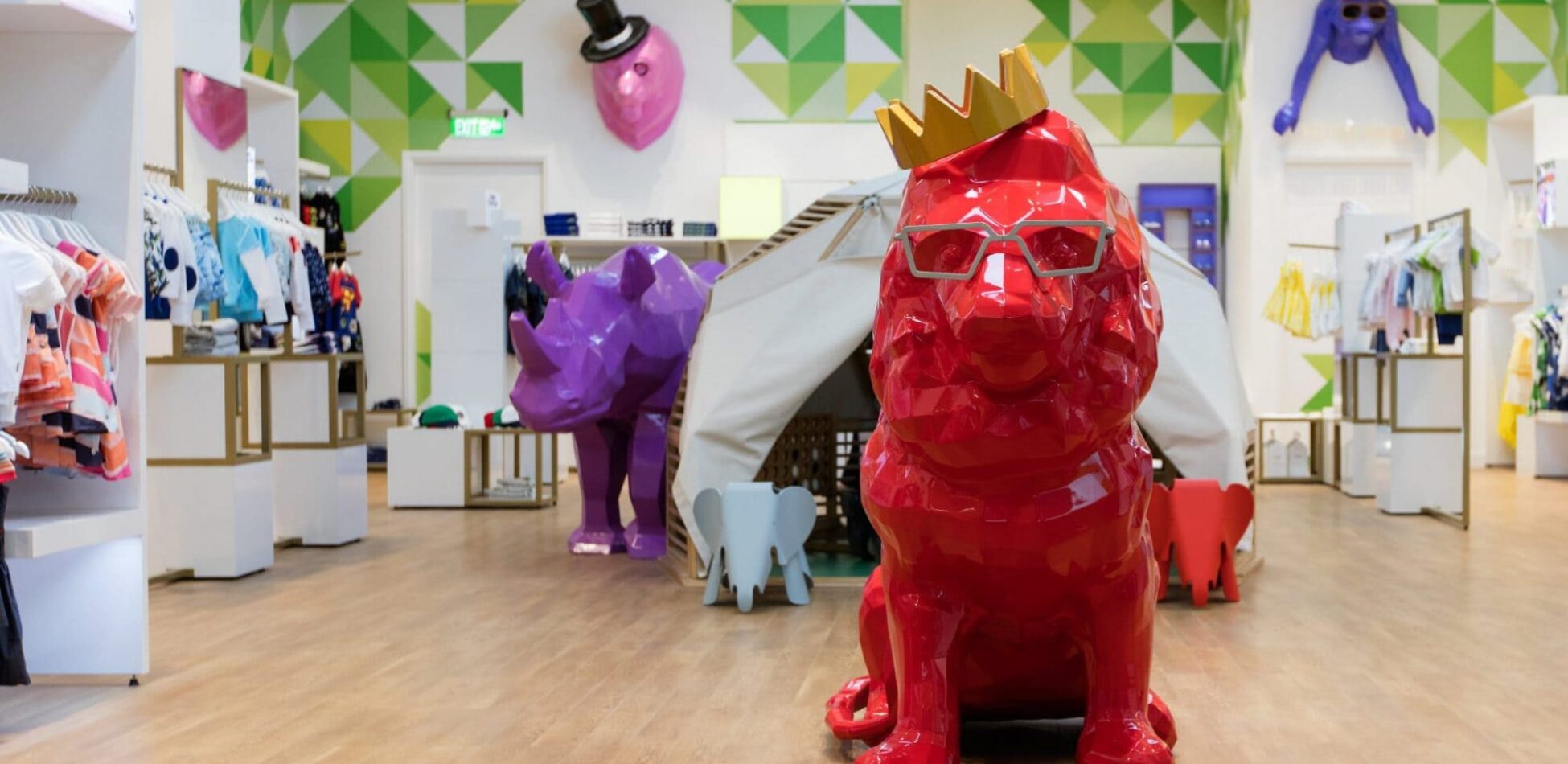 The adaptable eco-system of the Savanna creates flexibility and fluidity, uncovering opportunities for easy changes in-store with each season and new brand launch. However, it is the geometric animals which steal the show in this luxury fashion store. From the majestic red lion finished with a gold crown through to the baseball-cap wearing monkey