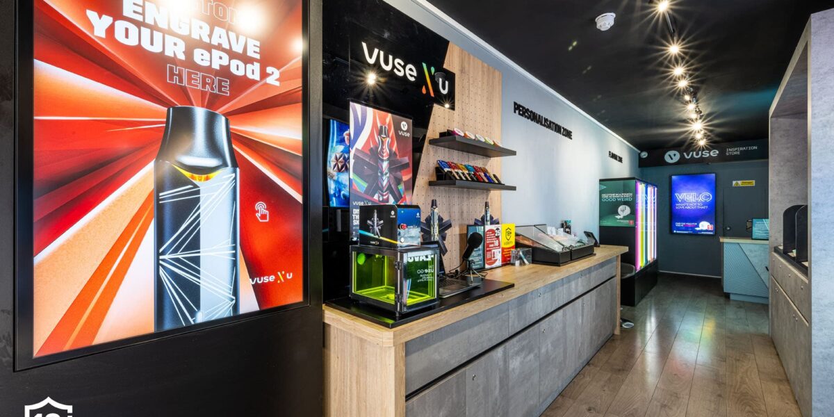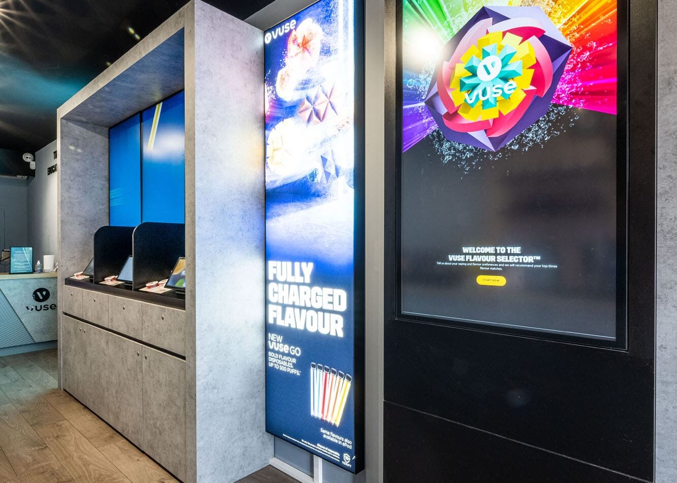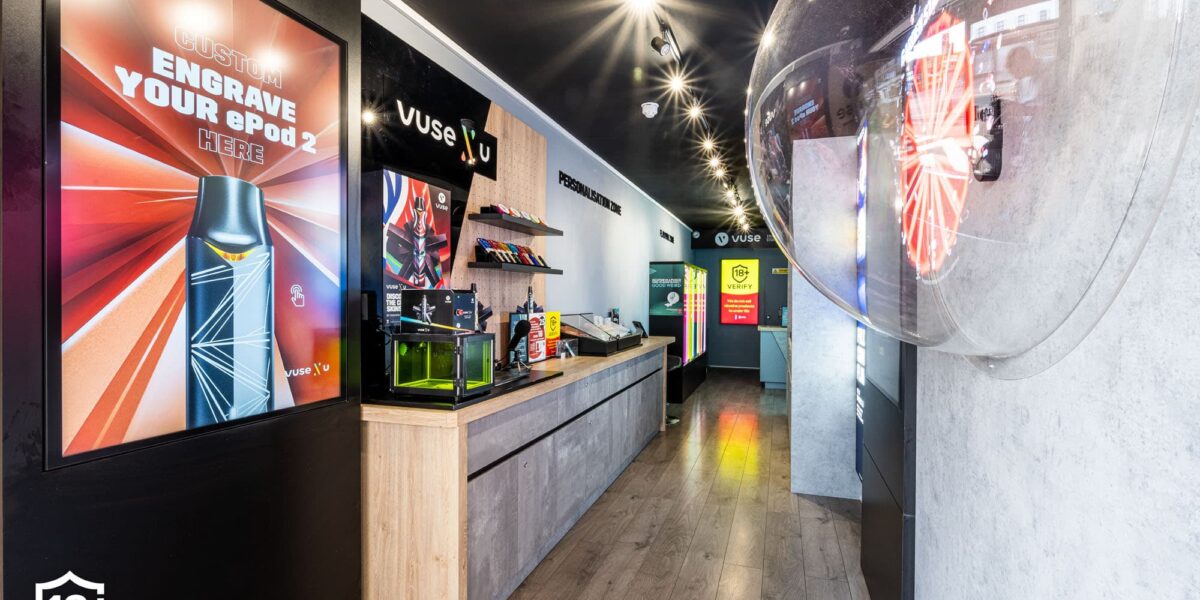 BOXPARK shoppers are met with a bold storefront exhibiting a white print VUSE logo on a black DiBond header, and welcomed into an entirely 3D and brand-immersive store experience via a hologram broadcasting exciting VUSE-branded content ā the first of many digital touchpoints in the pop-upās customer journey. An intuitive customer flow guides customers to a personalisation station where they can choose from a range of vapes which they can subsequently get engraved with the brandās VUSE x U service.